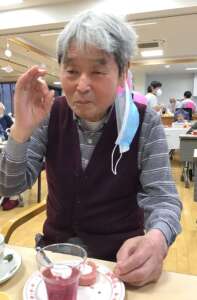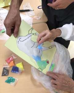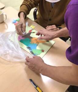 ご利用者様の力作の塗り絵や、職員と一緒に制作した砂絵などが飾られ、皆さんと一緒に鑑賞しました。