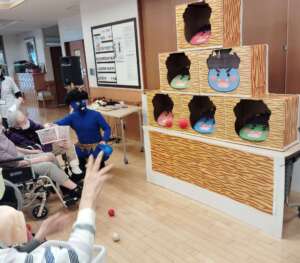 職員手作りの的当てゲームをして鬼を無事に退治する事ができました!